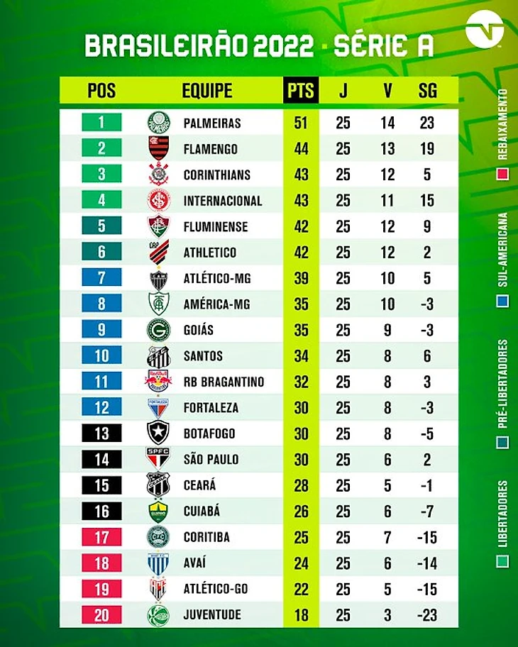 В турнирной таблице чемпионата Бразилии "Палмейрас" является абсолютным лидером на расстоянии семи очков от ближайшего преследователя.