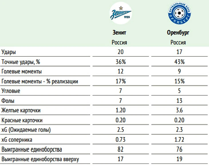 ⚖ Баланс матчей «Зенита» и «Оренбурга» в чемпионатах России: суммарный: +6=0-0, мячи 13:3 на поле «Зенита»: +3=0-0, мячи 8:2 последние три матча «Зенита» и «Оренбурга» на поле «Зенита» – 1:0, 3:1, 4:1