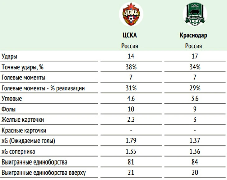 ⚖ Баланс матчей ЦСКА и «Краснодара» в чемпионатах России: суммарный: +8=8-6, мячи 28:32 на поле ЦСКА: +6=4-1, мячи 20:10 последние пять матчей ЦСКА и «Краснодара» на поле ЦСКА – 2:1, 1:2, 3:2, 3:1, 0:0.