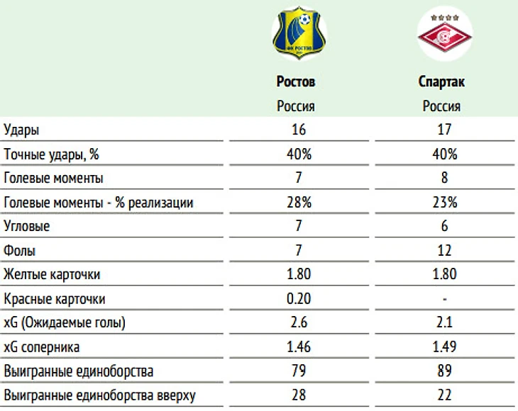 🕮 Факты: ◉ Шесть последних матчей «Ростова» и «Спартака» в Ростове-на-Дону завершались с тоталом больше 2.5, а их суммарная результативность составила 24 мяча, то есть в среднем забивалось по четыре гола за игру. ◉ Ростовчане прошли без поражений восемь стартовых туров. Это удалось им впервые за всю историю выступлений в чемпионатах России. ◉ Дома у «Ростова» серия из восьми матчей без поражений. ◉ «Ростов» остаётся единственной командой чемпионата, еще не проигравшей ни одного отдельно взятого второго тайма. ◉ За тренерскую карьеру Карпин пять раз побеждал «Спартак». Общий счет в личном противостоянии с бывшим клубом – 5:3 при одной ничьей. При этом из четырех последних встреч с красно-белыми ростовчане под руководством главного тренера сборной России выиграли три, уступив только в апреле прошлого года команде Доменико Тедеско.