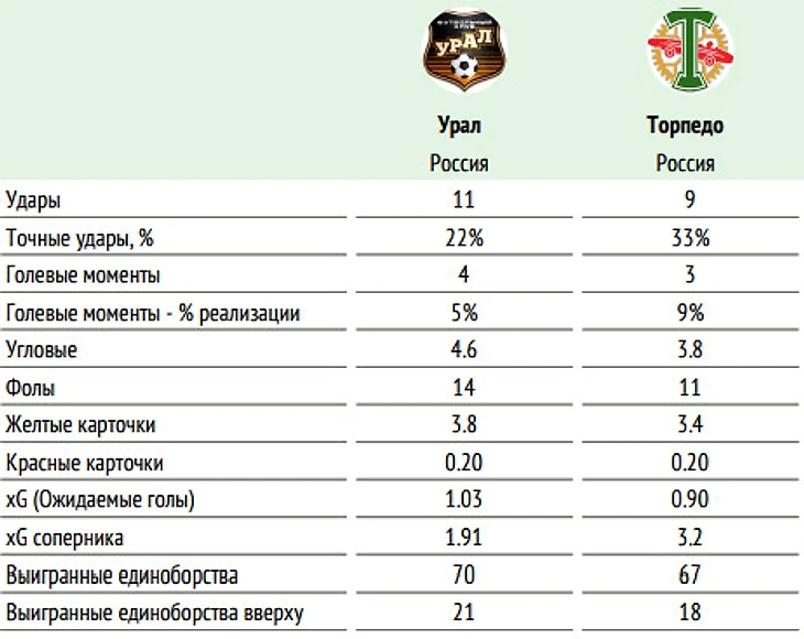 ❌ Не сыграют: «Урал»: Баклов, Цулукадзе (оба – травм.), Шатов (под вопросом). «Торпедо»: Ботнарь (травм.).