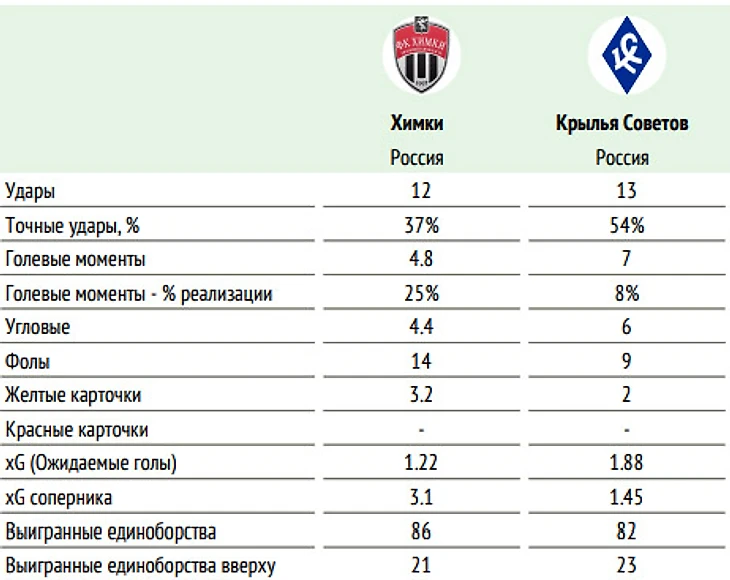 🕮 Факты: ◉ В среднем в матчах «Химок» и «Крыльев Советов», сыгранных в Премьер-Лиге, забивается по 3.125 гола. ◉ «Химки» проиграли четыре матча подряд. ◉ Из 12 последних матчей «Химки» только один сыграли вничью. ◉ «Химки» - худшая команда РПЛ по игре в первых таймах. В них подмосковная команда набрала 2 очка из 21 возможного, забив лишь два мяча и пропустив 12. ◉ У «Крыльев Советов» в последних семи матчах лишь одна победа. ◉ «Крылья Советов» 12 матчей подряд не могут сыграть в обороне на ноль. Это самая длинная текущая серия с пропущенными мячами среди всех клубов РПЛ. ◉ «Крылья Советов» пропустили пять мячей с угловых в этом сезоне РПЛ – это худший результат в лиге. Также самарцы - худшие в этом сезоне РПЛ по проценту голов, пропущенных со стандартов (7/12 - 58%). ◉ 15 голов в пяти матчах чемпионата и Кубка России пропустили «Химки» после увольнения Сергея Юрана. В чемпионате химчане уступили «Ахмату» (1:3), «Локомотиву» (0:3), «Сочи» (1:4) и «Оренбургу» (1:3), а в Кубке – «Краснодару» (0:2)