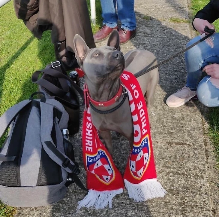 Тайский риджбек по кличке Призрак в клубной атрибутике «Гресли Роверс» – английского футбольного клуба из Черч-Гресли, Южный Дербиши. Тайский риджбек – довольно древняя порода, которая упоминается в документах, написанных около 360 лет назад и найденных при археологических раскопках в Таиланде.