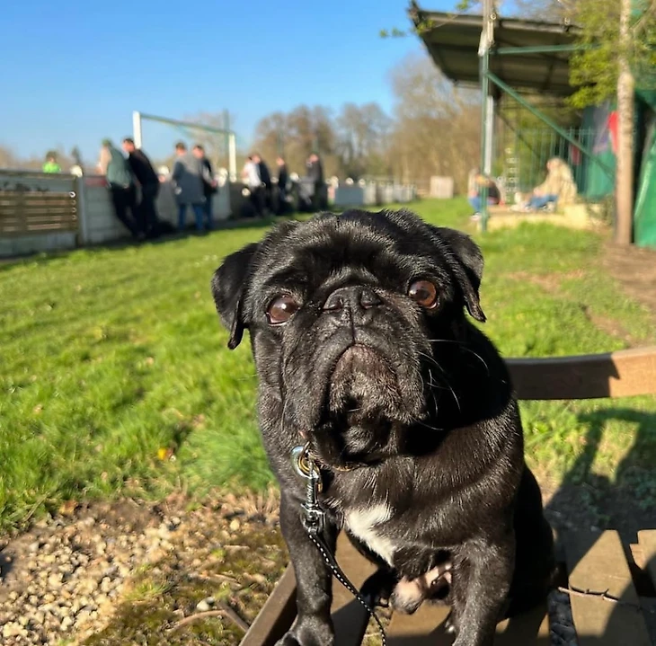 Мопс Винстон немного огорчен поражением родной команды – «Годалминг Таун» полупрофессиональный клуб из Годалминга, графство Суррей, Англия. Мопс – живая иллюстрация к латинской поговорке «Multum in Parvo», которая переводится как «Многое в малом».