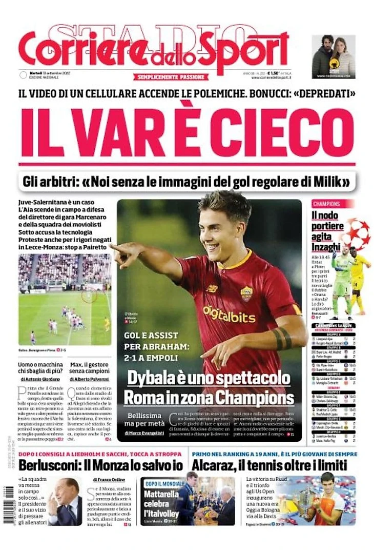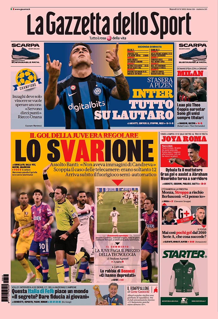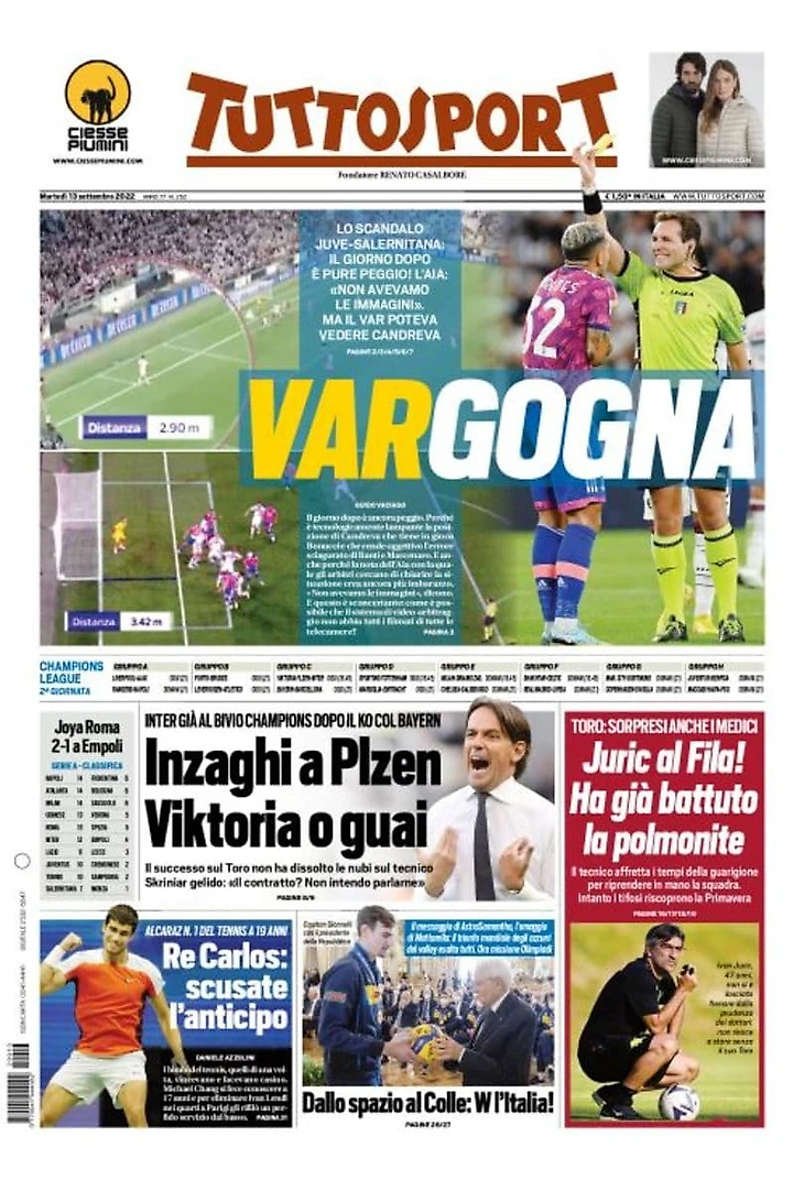 Скандал вокруг ВАР на матче «Юве» с «Салернитаной», а также сегодняшний матч «Интера» в Лиге Чемпионов – в обзоре заголовков итальянских спортивных изданий в блоге «В гостях у Кальчо».