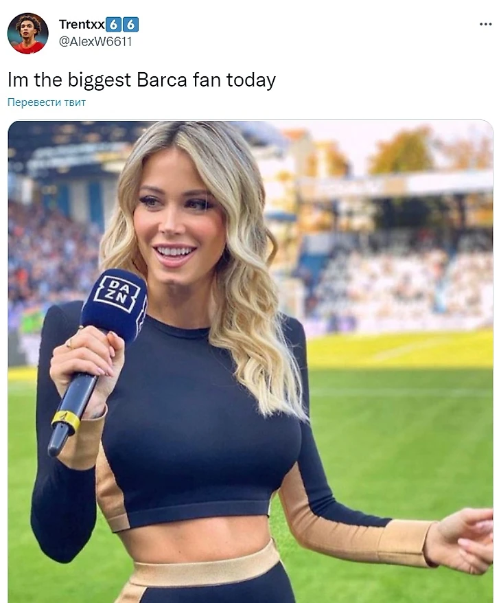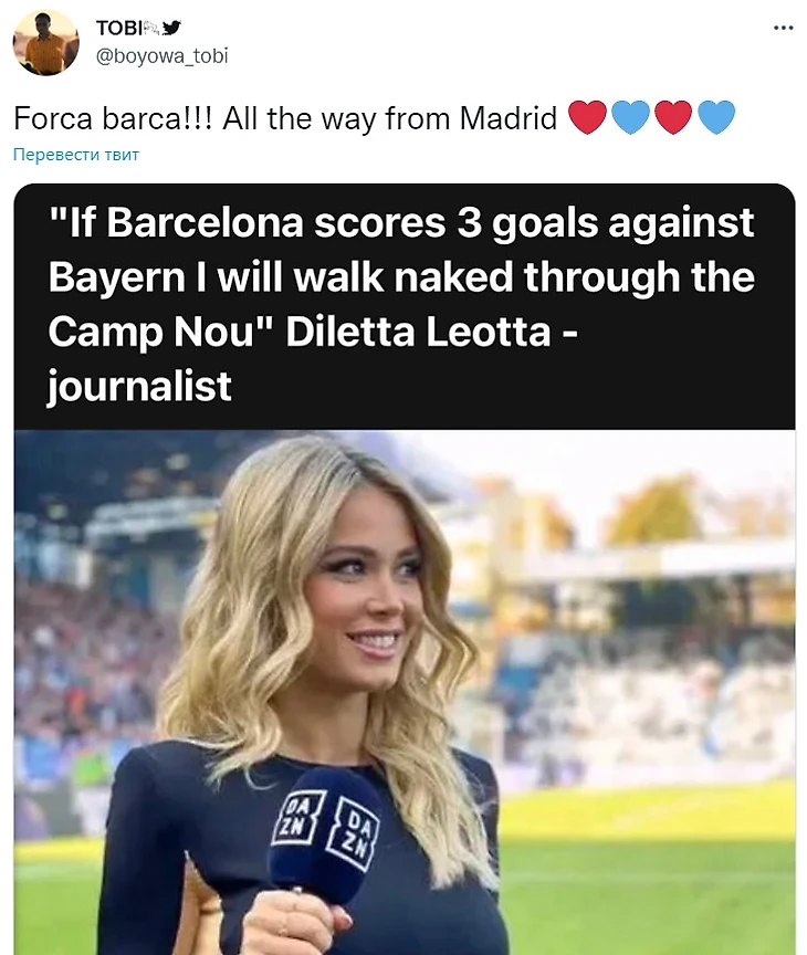 31-летняя итальянская журналистка DAZN перед матчем дала обещание, что она придет на ответный матч, который пройдет на «Камп Ноу» голой. Но только в том случае, если «Барса» обыграет мюнхенский клуб с преимуществом в 3 гола.