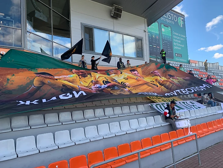 И, конечно, главное отличие между матчами «Ядра» и «Звезды» – наличие активного фан-сектора! За неделю до этого я встретил на стадионе буквально одного-двух человек в бело-красных шарфах среди общей массы местных жителей. У «ядерных» же был и заводящий, и барабан, и кореография – впечатляющий баннер с надписью «Живи ядерным футболом», который накрыл сектор в начале матча. Даже диктор у клубов разный. Если на «Звезде» с объявлениями по стадиону было негусто и даже чуть не забыли включить марш Матвея Блантера во время выхода игроков на поле – его, спохватившись, врубили внезапно уже после приветствий команд – то во время матча «Ядра» работал бодрый и весьма профессиональный диктор.