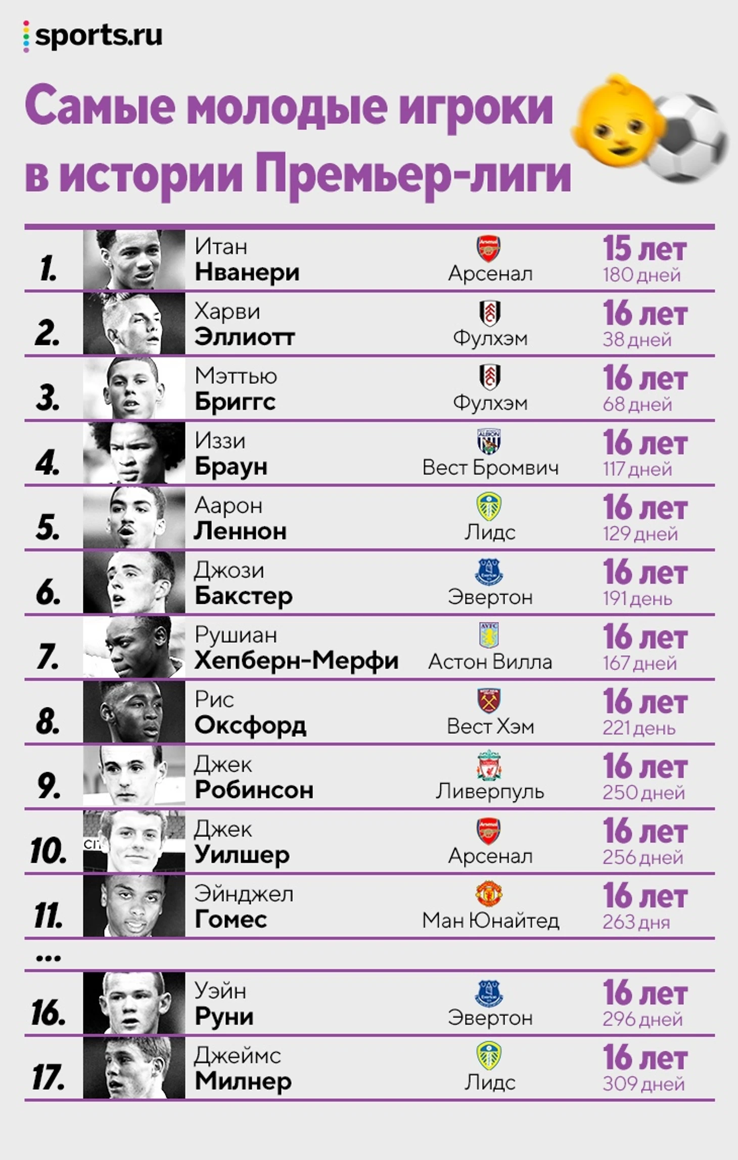 А вот так выглядит топ самых юных футболистов в истории Премьер-лиги.