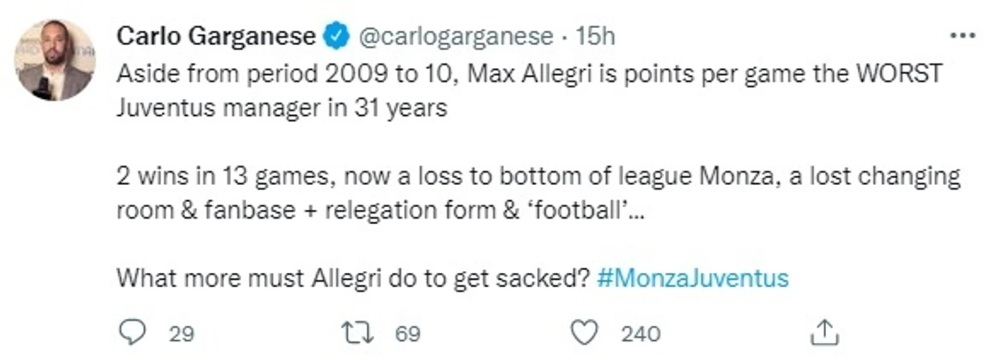 «Если не считать период с 2009 по 2010 год, Макс Аллегри является ХУДШИМ тренером «Ювентуса» за 31 год: 2 победы в 13 матчах, теперь поражение от аутсайдера чемпионата – «Монца», потерянная раздевалка и фанатская база…Что еще должен сделать Аллегри, чтобы его уволили?», - вопрошает журналист в Twitter.