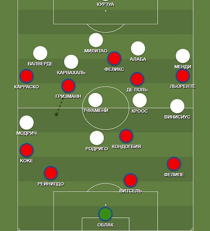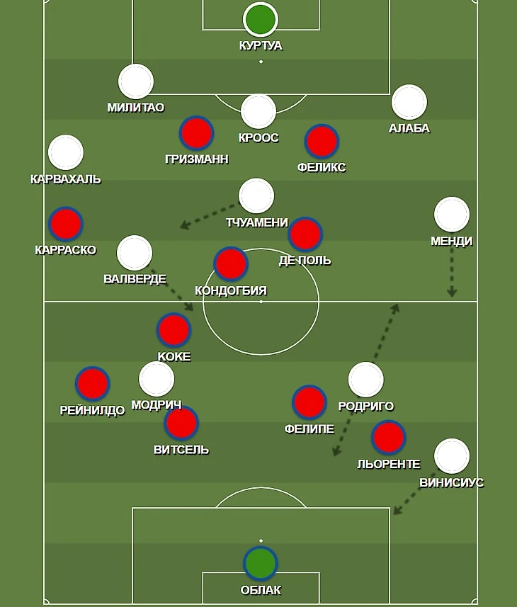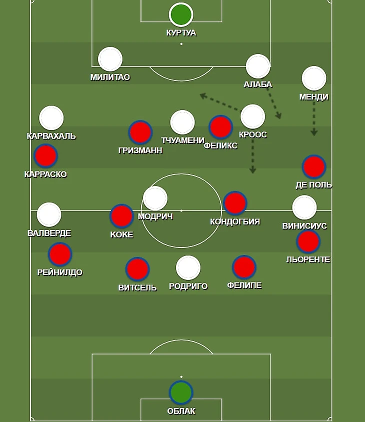 Но у действующих чемпионов Испании нашлось несколько интересных идей в начале и развитии атак. Тем более, что Атлетико нередко включал высокий прессинг, в котором явно были позиционные пробелы. В частности, хозяева не готовы были контролировать разнообразные перемещения Крооса, Менди и Алабы.