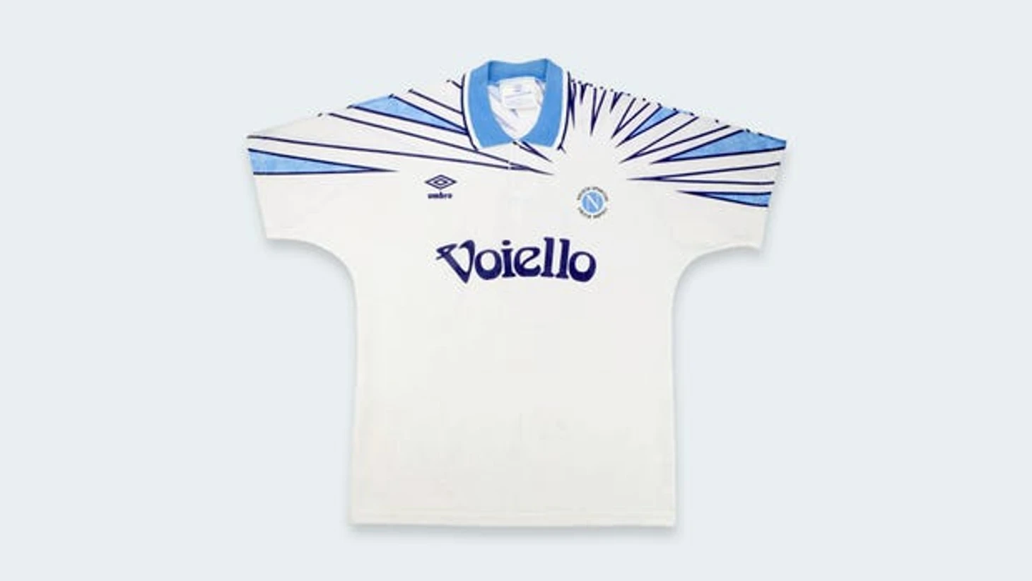 Как и многие выездные формы того времени, форма «Наполи» была покрыта абсолютно массивной графикой. В верхней части белой футболки расположено нечто, похожее на осколки стекла, направленные к гербу клуба. Даже цвет и шрифт логотипа спонсора — производителя пасты Voiello — дополняют общий дизайн.