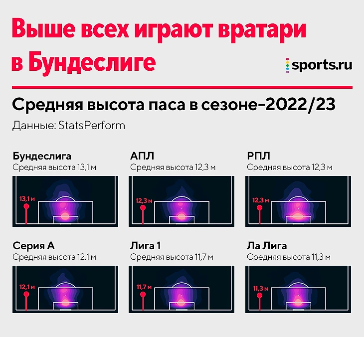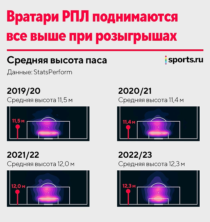 В этом сезоне РПЛ огромная концентрация смелых вратарей: Худяков и Ломаев учились у Нойера, Гогниев переобучает Лантратова, Сафонов прибавил в игре ногами, а Песьяков уже давно ценят за контроль мяча. Это помогает не отставать за европейскими трендами – наши вратари уступают только Бундеслиге по расстоянию от ворот при начале атак.