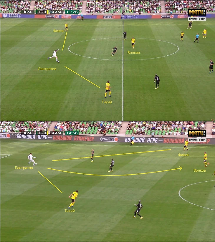 Илья агрессивнее подчищает за защитниками (при Юране действовал в штрафной) и поднимается третьим центральным при владении. Пока изменение роли скорее стилистическое – Лантратов играет длинными передачами (минимально отрезает более сложными передачами) и запускает Волкова в опорную зону к тройке полузащитников (вратарь остается чуть глубже двух центральных – помогает разбивать прессинг, создавая ситуации 3-в-2, что позволяет Волкову подниматься и создавать перевес на подборах).