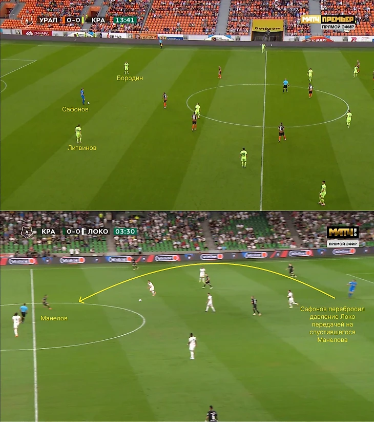 Похожие эпизоды случались и против «Крыльев» (2:1). В первом случае его выход помог освободить линию для передачи от Глебова (гости сместились чуть в сторону при пасе на Песьякова), во втором – запустил диагональ направо.
