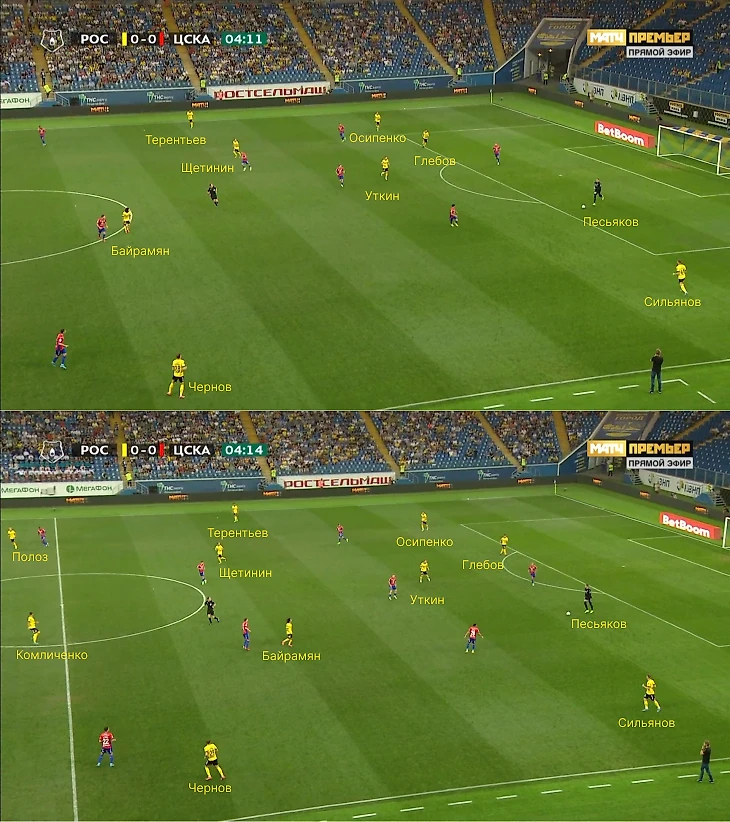 Ярчайший пример – серия эпизодов против ЦСКА (0:0), когда ростовская четверка легко путала тройку прессингующих гостей (Медина и Карраскаль терялись между игроками и зонами). В итоге скилл Песьякова стал одним из ярчайших моментов матча. Сначала он сделал несколько шагов вперед – Медина не понимал, что делать: перекрывать середину, прессинговать или закрывать Сильянова.