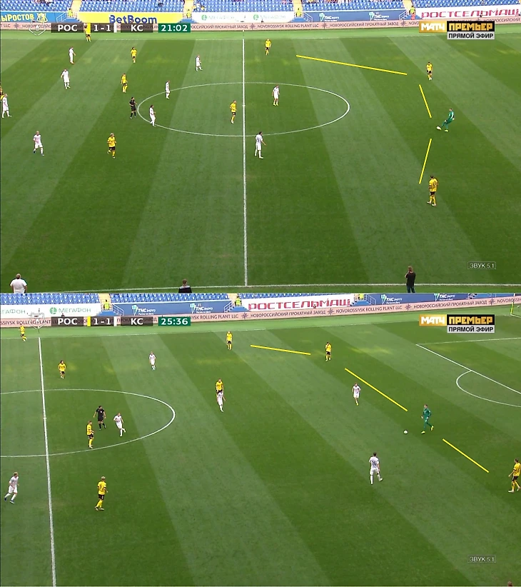 Гораздо интереснее другие вариации, когда «Ростов» переходит на четверку при владении через массовую смену позиций: Глебов и Песьяков остаются в середине на мяче, центральные защитники уходят в полуфланги (готовы подключиться в атаку), а крайние защитники на одной линии с полузащитой или даже выше (позволяет вингерам заполнять середину).