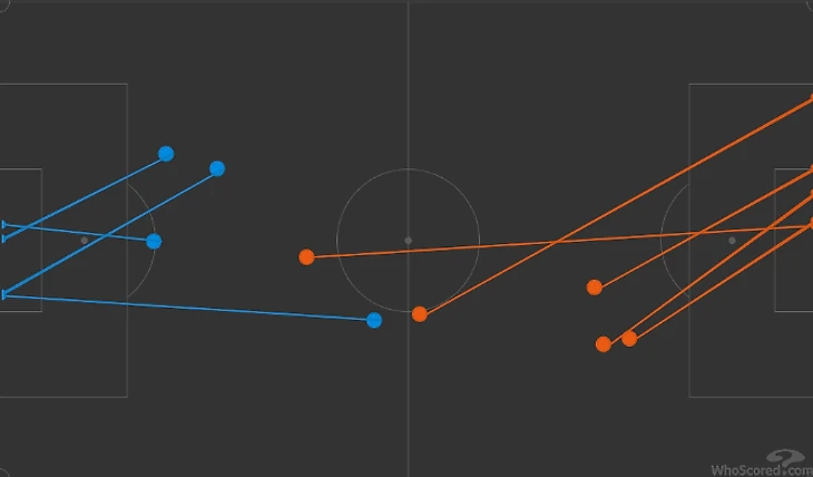 Данные Whoscored по ударам из-за штрафной в матче «Ростов» – «Крылья Советов». Слева ворота Сергея Песьякова, справа – Ивана Ломаева