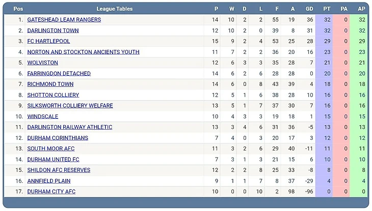 В Первом дивизионе Лиги Уирсайда продолжает пробиваться абсолютное дно. За 14 матчей всех турниров пропущено уже 143 (143!) гола. В лиге 0 очков и 98 пропущенных. Крупнейшее поражение в лиге от «Дарлингтон Таун» — 13:0. В кубке лиги от «Дарем Коринтианс» — 15:1.