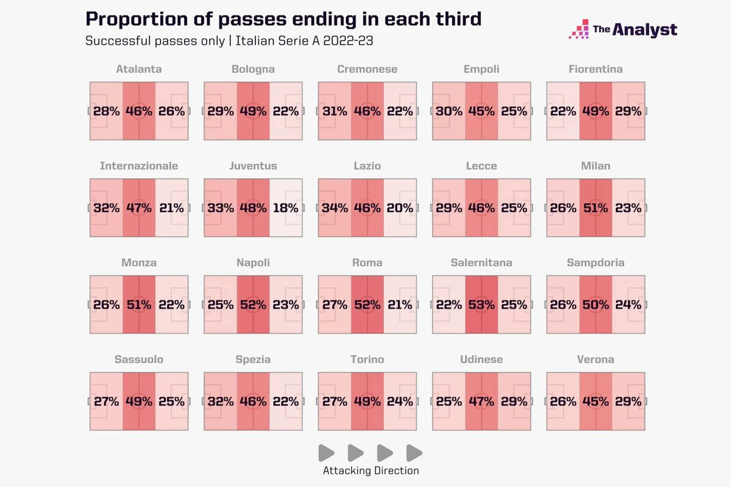 Помимо этого, Ювентус почти все точные передачи в среднем за игру осуществляет в центре поля и на своей половине. На последних 35 метрах поля Юве делает лишь 18% от общего числа точных передач, поскольку попросту редко там комбинирует и предпочитает отыгрывать дальними забросами.