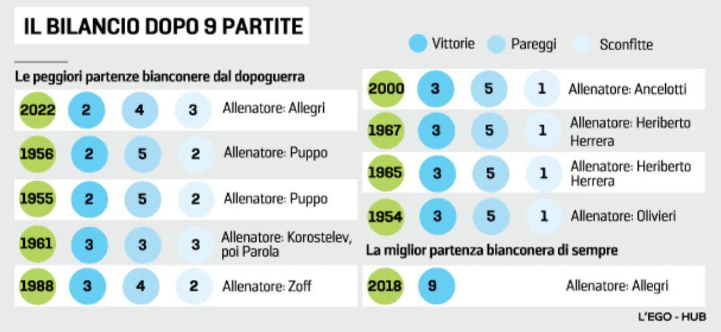 И последнее - с учетом первых игр в Серии А и Лиге Чемпионов Ювентус обрушил собственный отрицательный рекорд от 1956 года. Тогда в первых 9 матчах команда дважды проиграла и 5 раз сыграла вничью. Аллегри превзошел это достижение и проиграл трижды при двух победах. Что примечательно, в этом же компоненте лучший результат в 9 побед из 9 также принадлежит Аллегри.