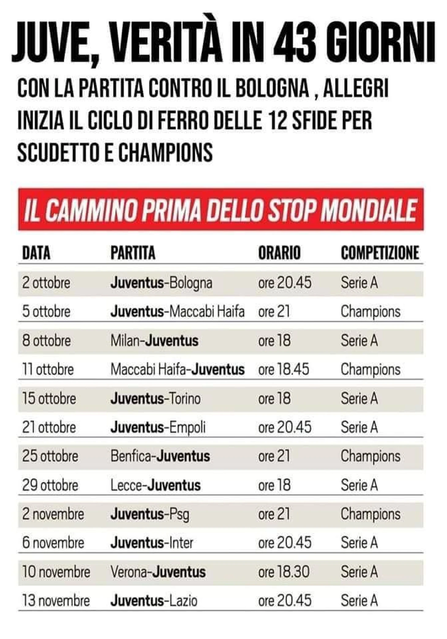 Начиная с воскресения и до перерыва на Чемпионат мира Ювентусу предстоит сыграть 12 матчей за 43 дня. Свои возможности на совершение ошибок команда уже исчерпала, однако с учетом постоянных травм и череды сложнейших соперников, произойти может все что угодно - от резкого подъема до такого же падения.