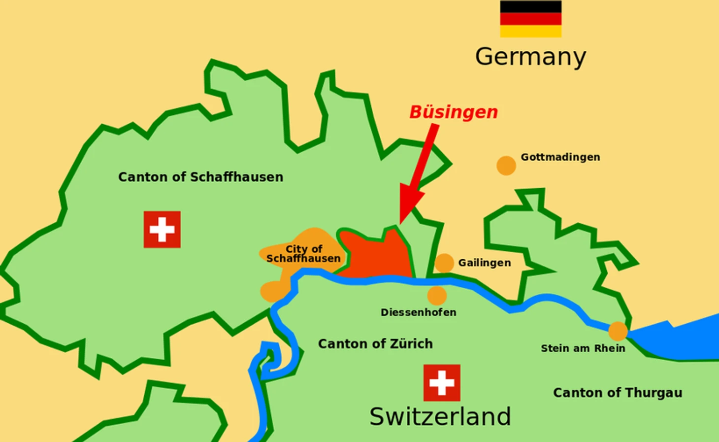 Иногда 96% голосов недостаточно, чтобы перенести несколько пограничных столбов. Так произошло с деревней Бюзинген, которая находится в Германии, хотя со всех сторон окружена Швейцарией. Впрочем, местный футбольный клуб давно порвал связи с ФРГ, как этого хотели местные жители.