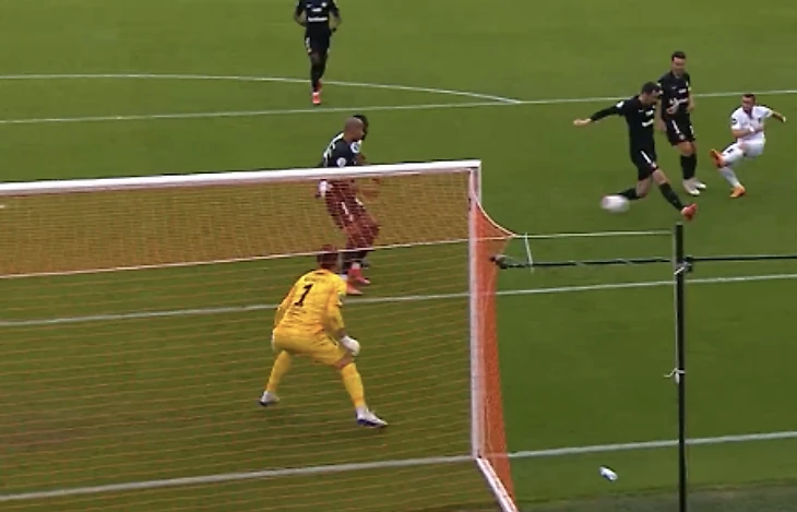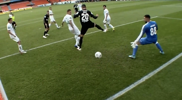 Урал-Ахмат гол Ахмата Помазун прижат к линии и находится прямо по центру, хотя удар из зоны левее центра.