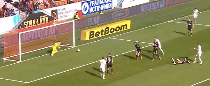 Гол Урала несильный удар щечкой с 14 метров. Шелия даже не падает, хотя мяч прошел рядом. Да, рядом был нападающий, но это не мешало упасть и отбить.