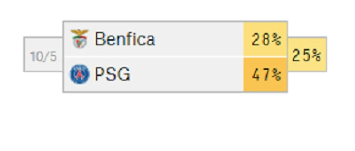 Первый матч двухматчевого противостояния пройдет в Португалии, но компьютер FiveThirtyEight все равно считает фаворитом команду Кристофа Гальтье – 47%. У ничьей или победы «Бенфики» вероятность примерно одинаковая – 25% и 28% соответственно.