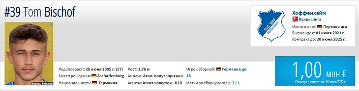 Хоффенхайм сделал Бишофа своим самым молодым дебютантом Бундеслиги, когда он вышел на замену в марте – награда за подписание долгосрочного контракта, несмотря на интерес со стороны Боруссии Дортмунд и РБ Лейпциг. Он левоногий плеймейкер, которому суждено добиться больших успехов после того, как он поступил в академию в возрасте 10 лет. Обладая хорошими навыками дриблинга, превосходным диапазоном передач и острым глазом на цель с любого расстояния, он доставляет удовольствие смотреть за его игрой. В этом году Бишоф забивал и ассистировал на уровне U-19, и можно ожидать, что в следующем году он будет регулярно выбираться в основной состав.