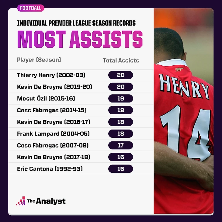 В сезоне 2019-20 Кевин Де Брёйне, спустя 17 лет, повторил достижение Тьерри Анри сезона 2002-03, когда тот отдал 20 голевых передач за сезон.