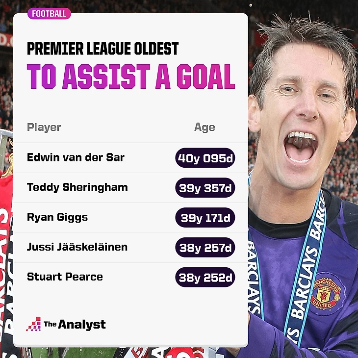 Даже имея сто попыток, будет очень тяжело сразу назвать самого возрастного игрока, который когда-либо отдавал голевую передачу в Премьер-лиге. И это вратарь Эдвин ван дер Сар, который помог забить гол в феврале 2011 года, когда «Манчестер Юнайтед» играл с «Астон Виллой». Ему было 40 лет, 95 дней. Это был единственный ассист голландца в Премьер-лиге, в его последнем из 10 сезонов в качестве игрока «Манчестер Юнайтед».