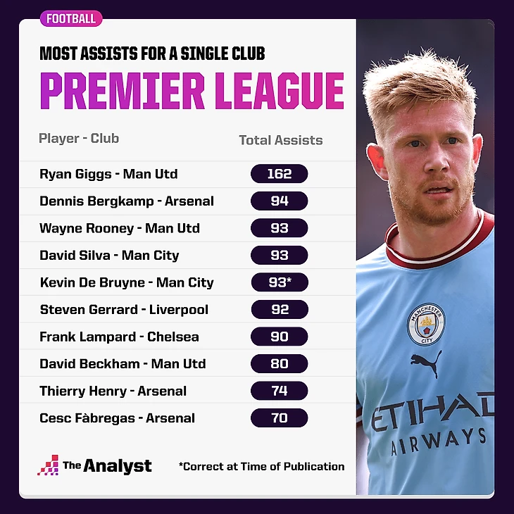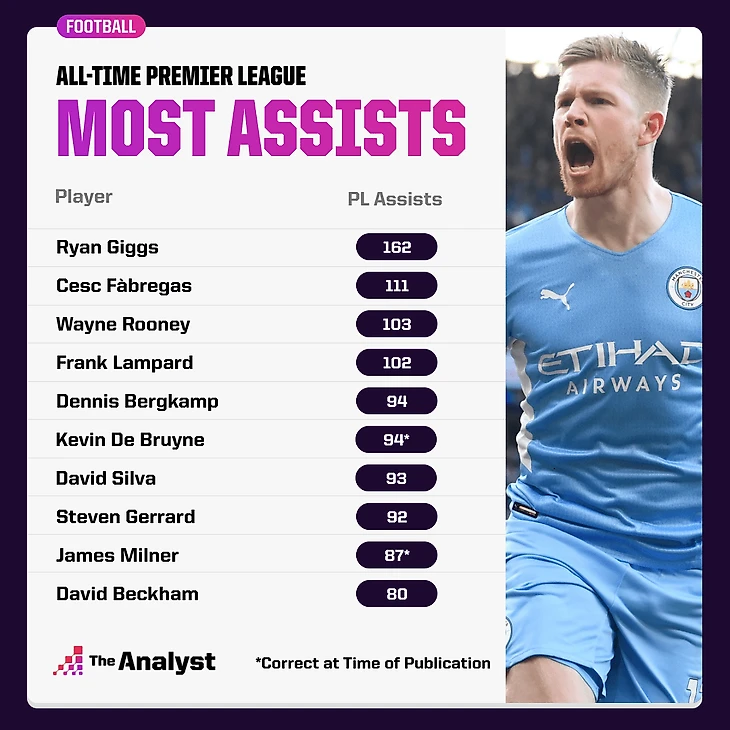 Помимо вышеупомянутых Гиггза и Фабрегаса, игроками, которые преодолели отметку в сто голевых передач в Премьер-лиге, являются Уэйн Руни (103) и Фрэнк Лэмпард (102). Но есть все шансы, что Кевин Де Брёйне в конце концов достигнет заветной «сотни». Недавно он обогнал Стивена Джеррарда (92) и бывшего одноклубника Давида Сильву (93) и сравнялся с Деннисом Бергкампом (94).