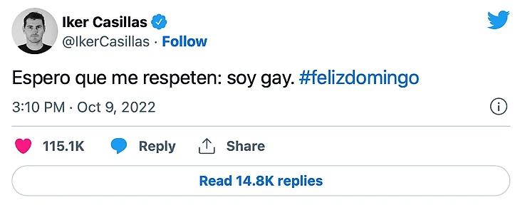 «Я надеюсь, вы будете уважать меня: я гей», – написал Касильяс.