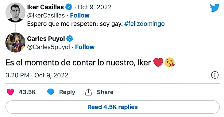 За неделю до класико Икер Касильяс написал в соцсетях: «Я – гей». Пуйоль ему ответил: «Время рассказать нашу историю»