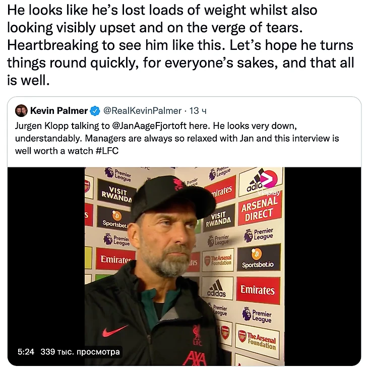 В послематчевом интервью, когда Клопп рассказывал о состоянии своей команды после игры с «Арсеналом», болельщики обеспокоились состоянием немецкого тренера. Клопп выглядел уставшим и психологически вымотанным.