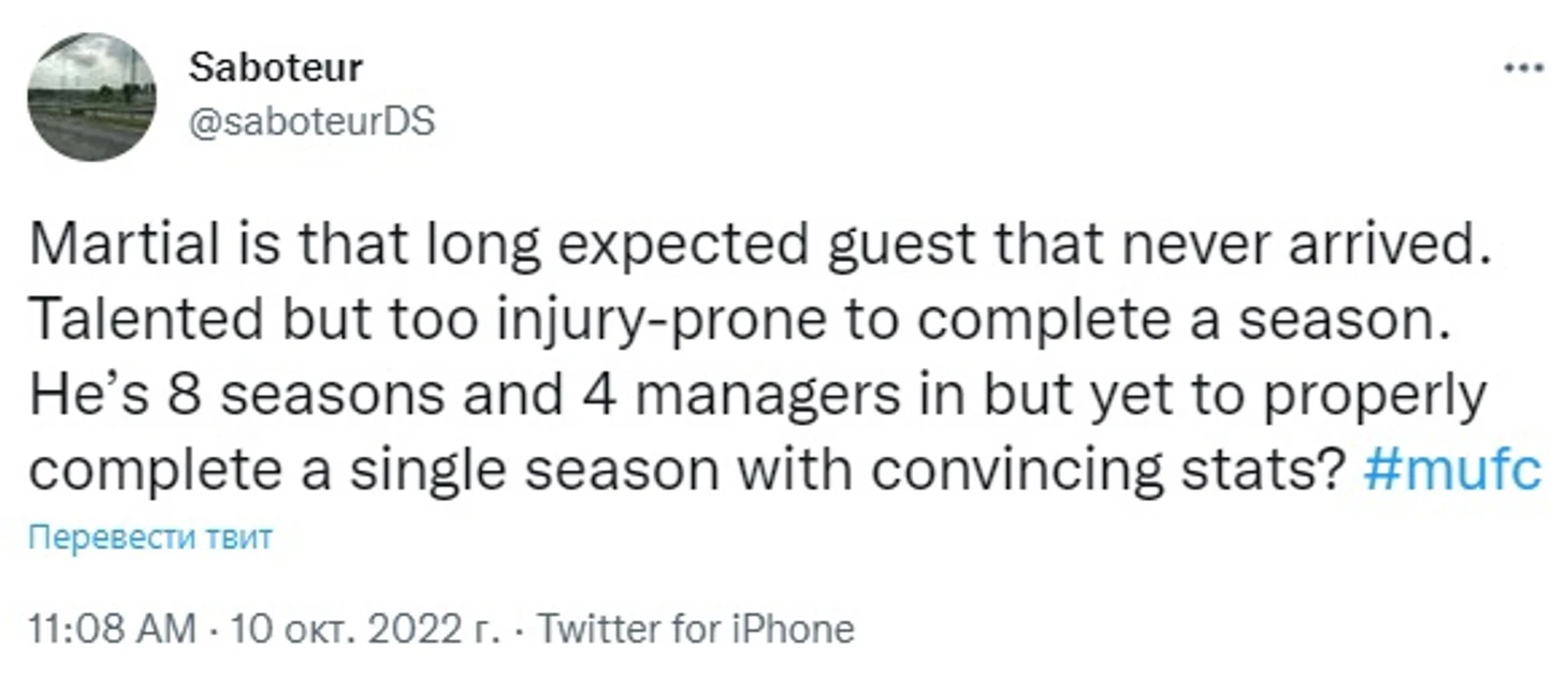 «Марсьяль — тот долгожданный гость, который так и не появился. Талантлив, но слишком подвержен травмам, чтобы завершить сезон. Он играл 8 сезонов и под руководством 4 тренеров, но не провел должным образом ни одного сезона с убедительной статистикой?»
