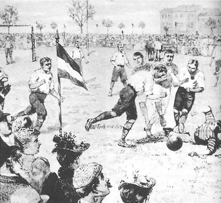 Мне почему-то вспоминаются матчи в России в 90е годы. 1990е. Но нет, речь про 1890е. Видимо, дураки, дороги и футбол в грязи – это навсегда. Ну, вот скажите, как такая яркая игра могла оставить равнодушными сердца людей? Тут просто без шансов. И футбол начинает развиваться. Появляются футбольные команды в Петербурге, Москве, Одессе, даже на Дальнем востоке. Но, конечно, до спортивного состязания было еще далеко. Всё это было лишь новомодной забавой мажоров. Из воспоминаний первых московских футбольных энтузиастов: