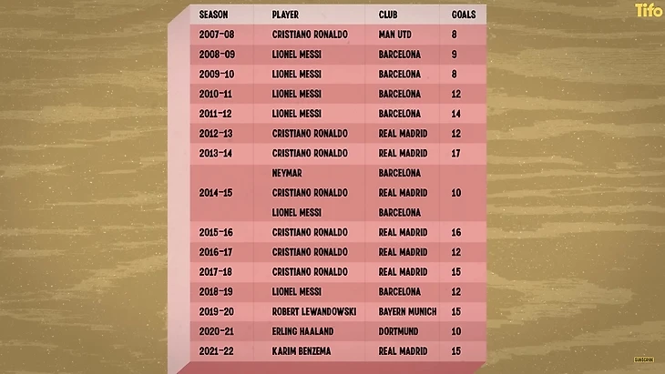 Аналогичное сравнение результативности сезонов в Лиге чемпионов с прошлыми является ошибочным подходом, главным образом из-за переформатирования турнира, но и здесь либо Месси и Роналду, либо их комбинация были лучшими бомбардирами на протяжении каждого из сезонов в течение 12 лет.