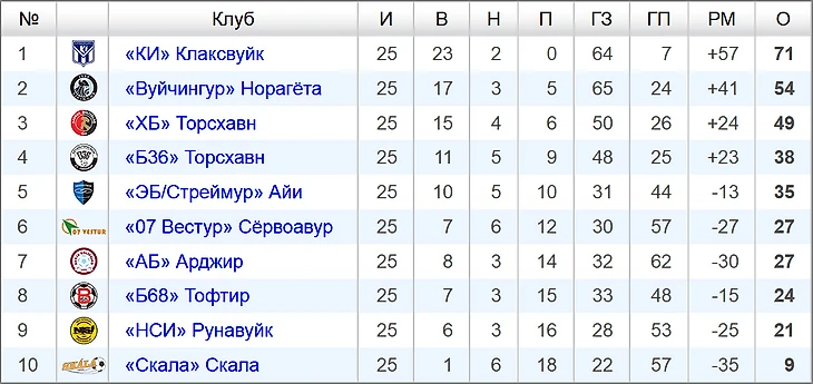 Турнирная таблица фарерской премьер-лиги