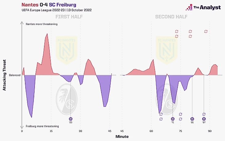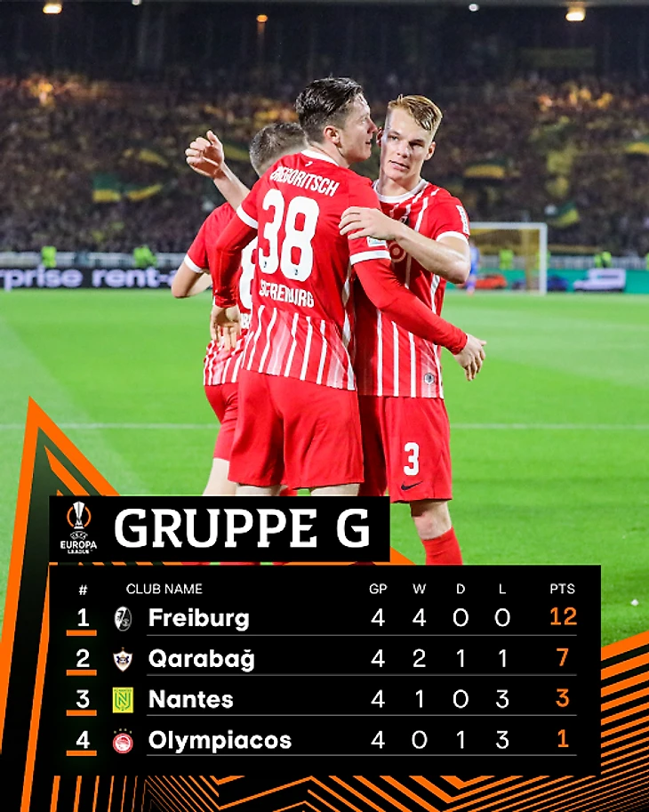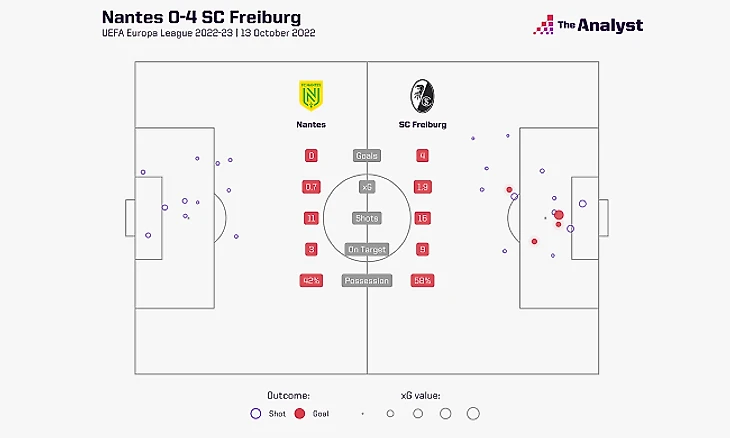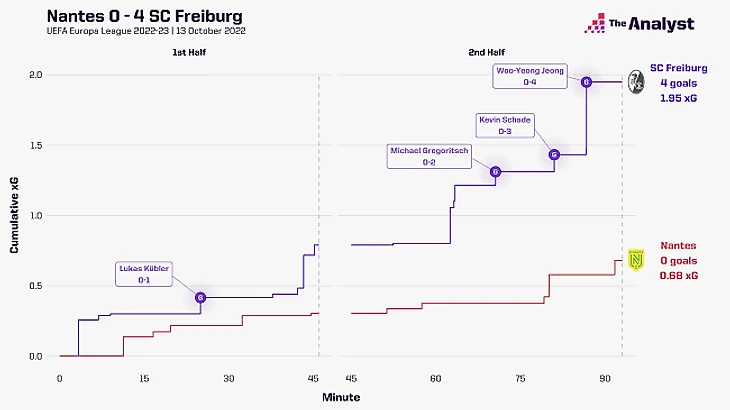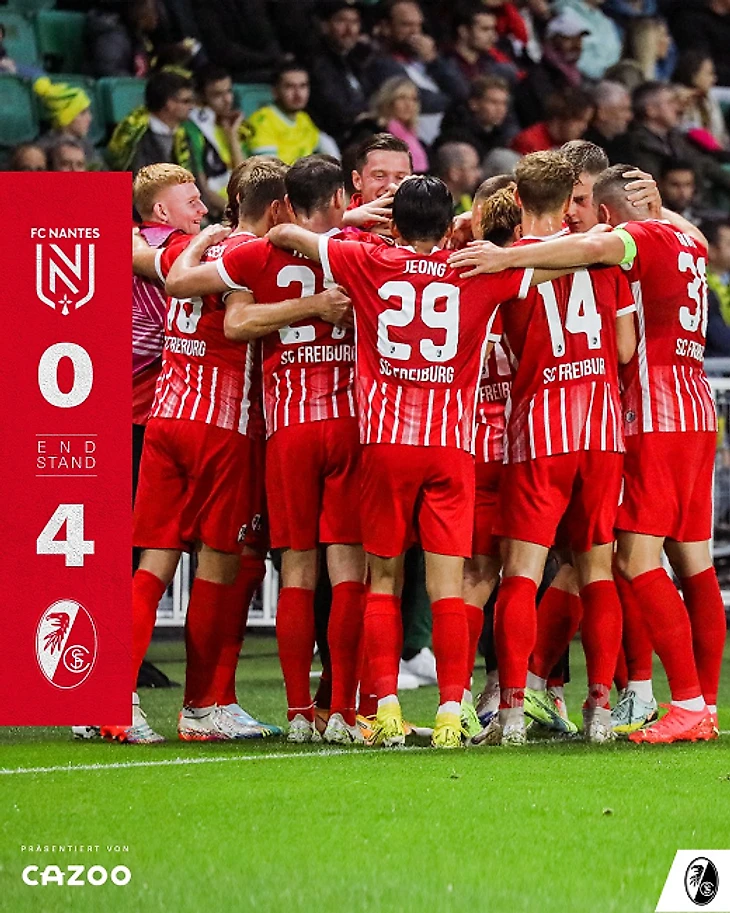 На 24-й минуте Кристиан Гюнтер свободно простреливает в центр штрафной, Лафонт отбивает перед собой — Лукас Кублер открывает счет — 0:1. А на 71-й тот же Гюнтер без помех навешивает на Чон Ву Ёна и после его скидки забивает Грегорич — 0:2. Между этими эпизодами еще уместился возможный пенальти в ворота гостей, однако видеоповторы дали понять — надеяться на одиннадцатиметровый «Нанту» не стоит.