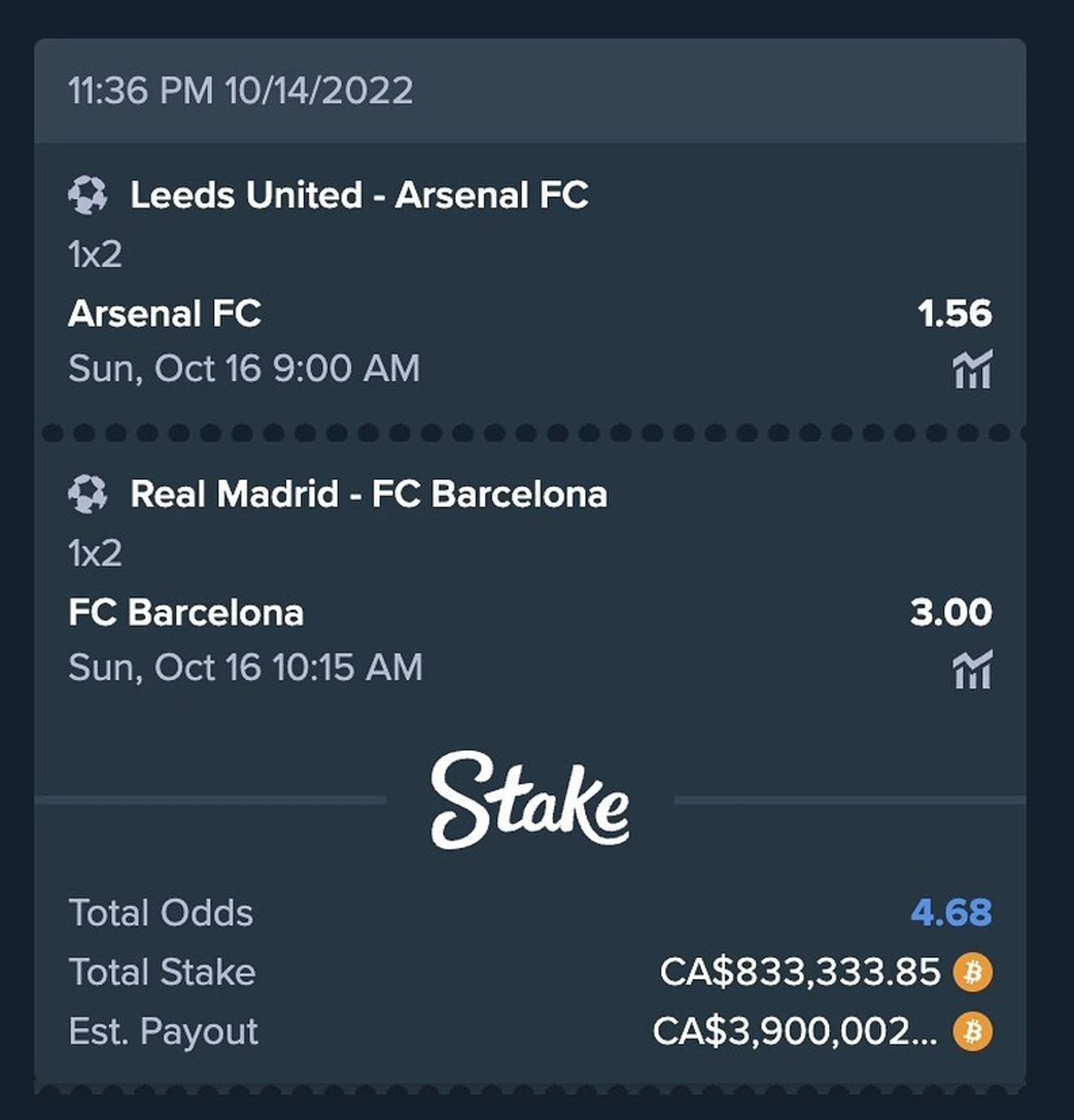 Дрейк поставил на победу «Арсенала» в матче с «Лидсом» с коэффициентом 1,56, ну а в класико, конечно, верит в «Барселону» – ставка с кэфом 3,00.
