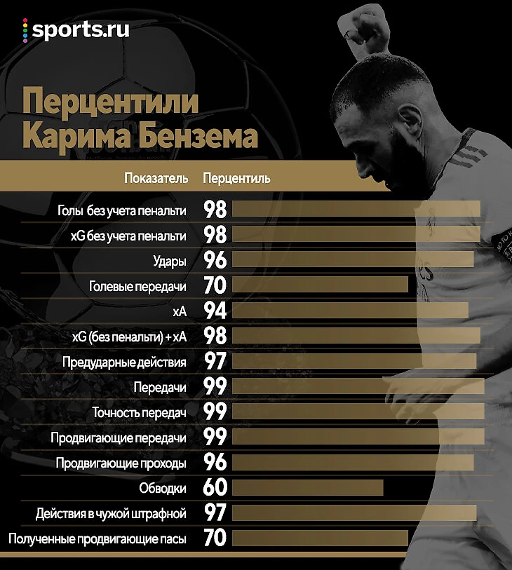 Лучше всего это передается через перцентили (не пугайтесь слова – сейчас объясним). Это основанные на данных рейтинги игроков. Перцентиль 99 означает, что игрок входит в топ-1% по показателю на своей позиции за последние 365 дней в топ-5 лигах. Мощь прямо во всех аспектах позволяет назвать Карима совершенным атакующим игроком: