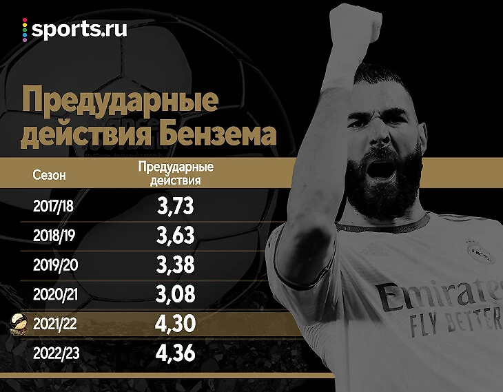 Ультраполезность Бензема во всех стадиях атаки – давняя традиция, но прошлый сезон получился уникальным даже по его меркам. 4,30 предударных действия на 90 минут – шикарный показатель для нападающего. И Бензема пришел к нему вообще без стандартов, которые иным игрокам завышают статистику. Вот цифры по карьере Карима (сезоны, по которым есть данные):