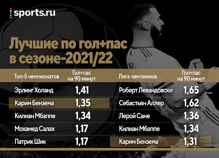 В топ-чемпионатах уступил только Эрлингу Холанду (который выбивал статистику в более результативной лиге и на меньшей выборке, так как часто ломался). В ЛЧ тоже держал темп заметно выше 1 балла за матч. Занял пятое место, но: 1) просто вспомните сетку «Реала» в плей-офф; 2) не забывайте, что Бензема сыграл больше всех (труднее на такой выборке удерживать топ-показатели):