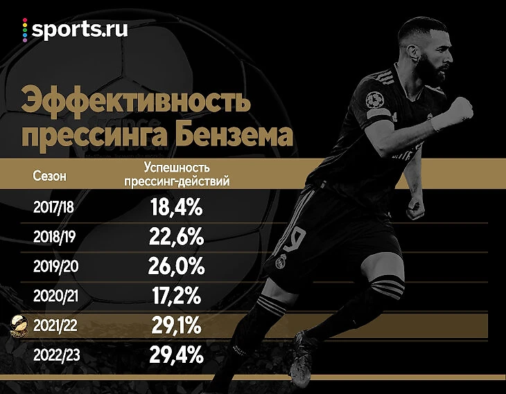 29,1% успешности означает, что в таком количестве эпизодов после давления Бензема мяч переходит к «Реалу» в течение 5 секунд. Раньше этот показатель у него был ниже. В стиле «Мадрида» и возрасте Бензема необязательно идти в давление в каждом эпизоде. Важнее правильнее выбирать эпизоды. Тут Карим – мастер.