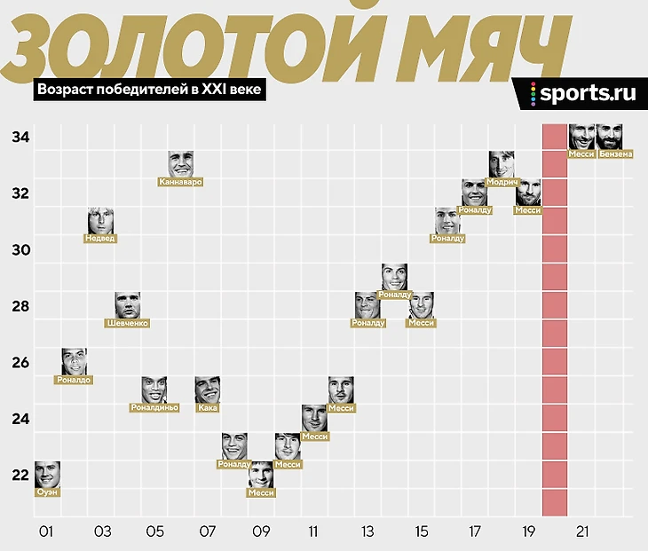 Тенденцию на «Золотые мячи» после 30 лет задали, конечно, Лео и Криштиану. До начала их дуэли «ЗМ» после 30 лет брали всего дважды (Недвед и Каннаваро). Теперь же игроки 30+ взяли шесть призов подряд (а могло бы быть семь, если бы Левандовски получил награду в 2020-м).