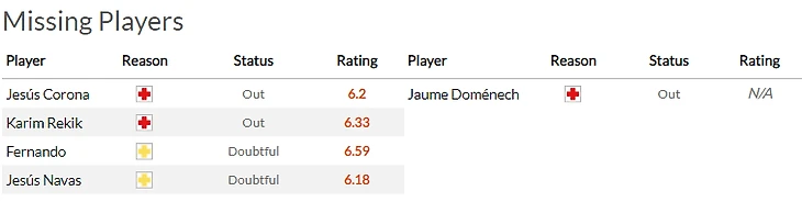 У хозяев кстати тоже были определенные сомнения относительно своих суперветеранов, но вот Хесус Навас(6,5) смог скоренько залечить свои болячки и имеет все шансы выйти на поле в отличии от разболевшегося Фернандо(6).