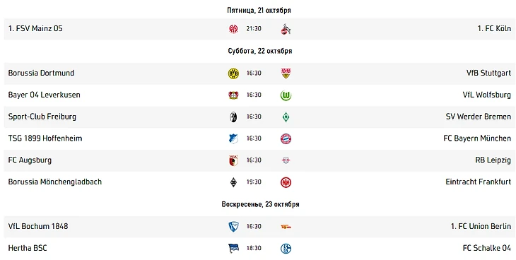 Очередной тур немецкого чемпионата откроют в пятницу в Майнце местная команда и гости из Кёльна, матч обещает быть ярким. В субботу нас порадует встреча второй и четвертой команд лиги (а это «Бавария» и «Хоффенхайм»), Хаби Алонсо попробует исправить бедственное положение Леверкузена. В Гладбах прилетят «орлы» и попробуют прочнее закрепиться в лидирующей группе. В воскресенье в Бохум приедет лидер чемпионата – бесстрашный «Унион» Берлин. «Шальке» вновь будет пытаться вынырнуть со дна турнирной таблицы.