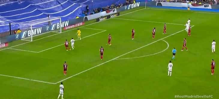 «Мадрид» находился в позиционной атаке. Родриго получил мяч на левом фланге, увидел открывшегося в центре Марко Асенсио, который, в свою очередь, отметил свободного Вальверде. Уругваец получил пас, обработал его и мощно ударил из-за пределов штрафной. Мяч полетел быстро и точно в дальнюю девятку. У вратаря «Севильи» Яссина Буну шансов не было: он просто махнул рукой мимо мяча.
